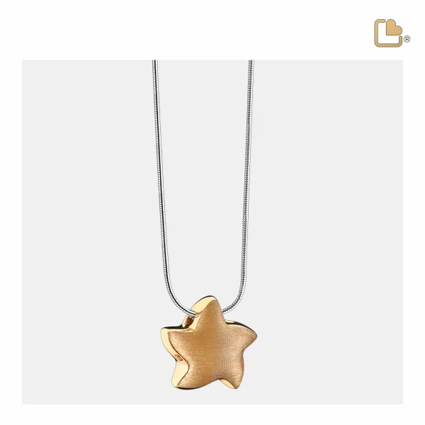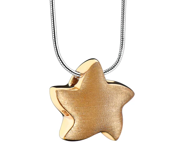 Dieser handgefertigte Ascheanhänger aus vergoldetem 925er Sterlingsilber stammt aus der exklusiven LoveUrns Treasure Kollektion. Mit einer wunderschönen, glänzenden und matten Goldoberfläche. Angelic Star™ Stern Asche Anhänger vergoldet mit Halskette.