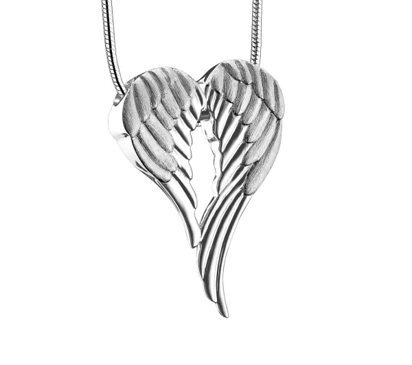 Dieser handgefertigte Ascheanhänger aus 925er Sterlingsilber stammt aus der exklusiven LoveUrns Treasure Kollektion. Mit einer wunderschönen, glänzenden und matten Silberoberfläche. AngelWings™ Asche Anhänger Silber mit Halskette.