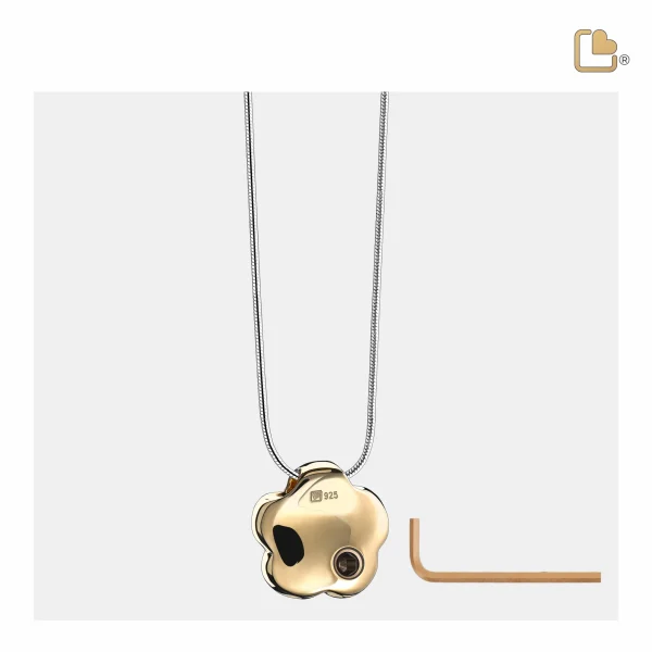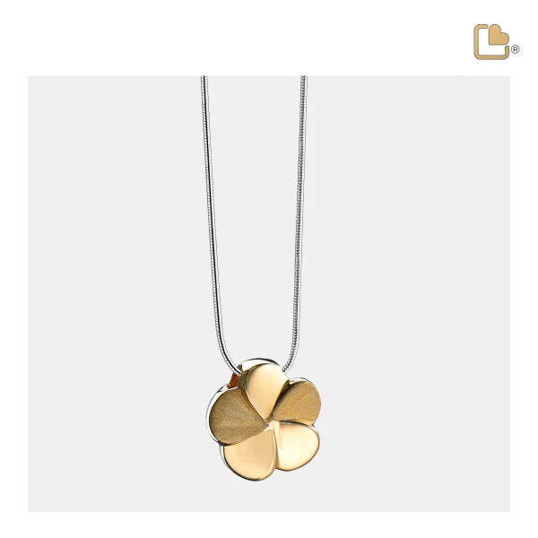 Dieser handgefertigte Ascheanhänger aus vergoldetem 925er Sterlingsilber stammt aus der exklusiven LoveUrns Treasure Kollektion. Mit einer wunderschönen, glänzenden und matten Goldoberfläche. Bloom™ Blume Asche Anhänger vergoldet mit Halskette.