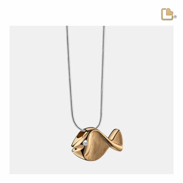 Dieser handgefertigte Ascheanhänger aus vergoldetem 925er Sterlingsilber stammt aus der exklusiven LoveUrns Treasure Kollektion. Mit einer wunderschönen, glänzenden und matten Goldoberfläche und Zirkonia-Stein. Fish™ Asche Anhänger Fisch vergoldet mit Zirkonia Stein.