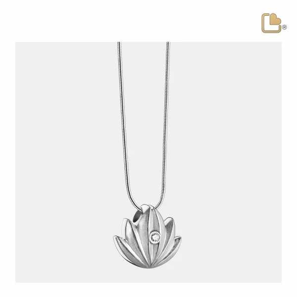Dieser handgefertigte Ascheanhänger aus 925er Sterlingsilber stammt aus der exklusiven LoveUrns Treasure Kollektion. Mit einer wunderschönen, glänzenden und matten Silberoberfläche und einem Zirkonia-Stein. Lotus™ Asche Anhänger Silber mit Zirkonia Steinn.