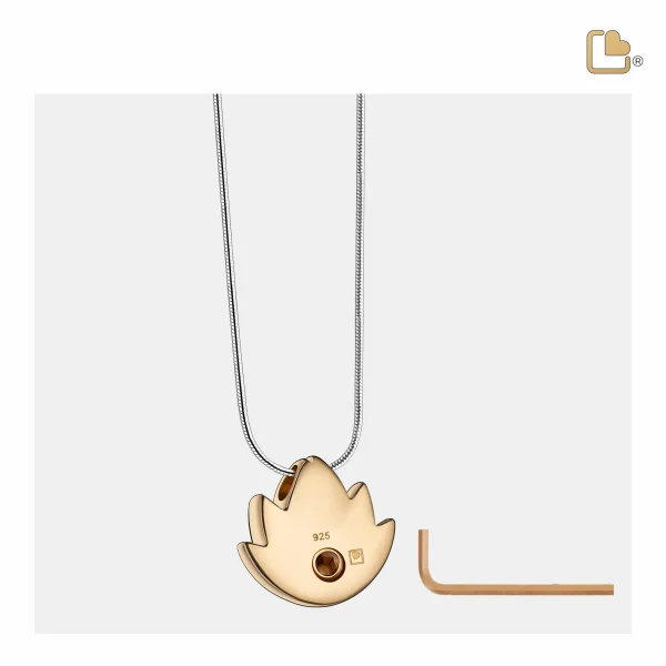 Dieser handgefertigte Ascheanhänger aus vergoldetem 925er Sterlingsilber stammt aus der exklusiven LoveUrns Treasure Kollektion. Mit einer wunderschönen, glänzenden und matten Goldoberfläche und Zirkonia-Stein. Lotus™ Asche Anhänger vergoldet mit Zirkonia Stein & Halskette.
