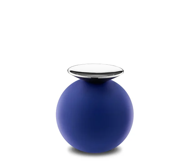 Einzigartig im Stil zieht diese kugelförmige Urne mit ihrem indigoblauen Farbton alle Blicke auf sich. Ein polierter silberner Verschluss unterstreicht die Farbe und betont die harmonische, runde Form.