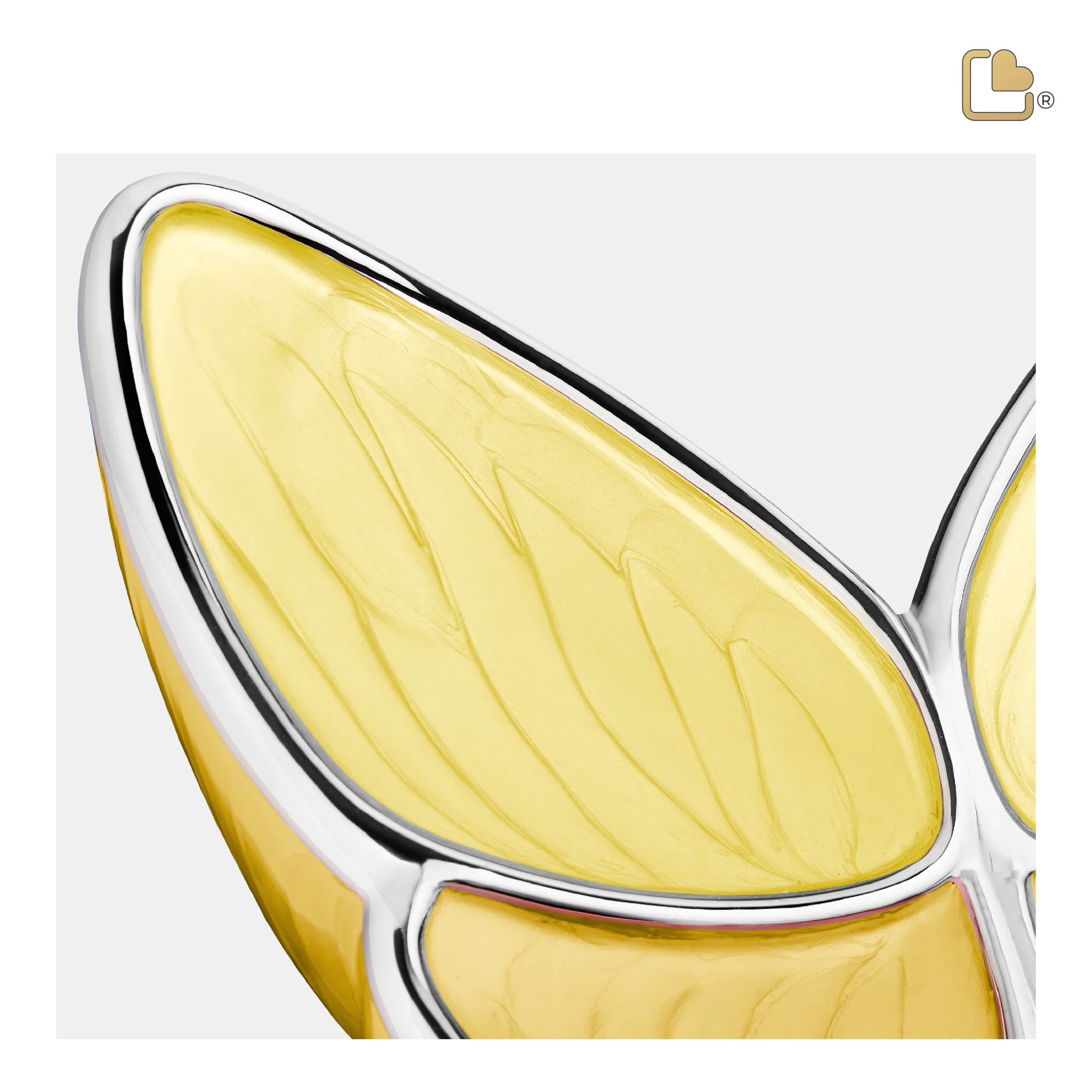 Die Wings of Hope™ Schmetterling Urne ist eine wunderschöne, elegante Urne.Der gesamte Schmetterling ist mit handaufgetragenem Emaille in einem leuchtenden Gelbton überzogen. Das sanfte Perlgelb verkörpert Optimismus und positive Energie, während die polierten Silberakzente Eleganz und Raffinesse verleihen. Unter dem perlmuttartigen Glanz sind feine Pinselstriche sichtbar, die den Flügeln der Schmetterlingsurne Struktur verleihen.Mit sorgfältig aufgetragenen Silberkonturen, die den äußeren Rändern der Flügel folgen, strahlt die Urne eine ätherische, himmlische Anmut aus und bildet ein wunderschönes, harmonisches Ganzes.
