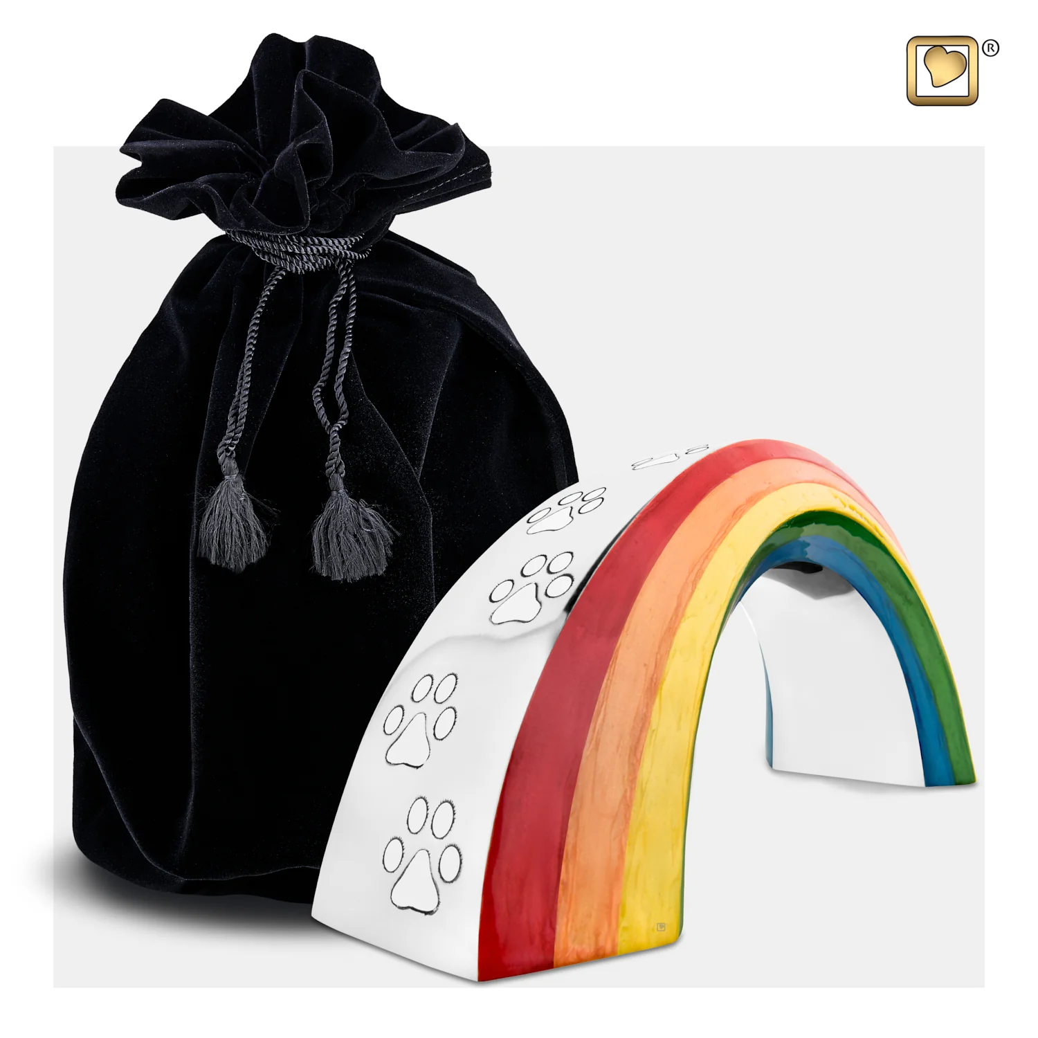 Diese Tierurne ehrt auf wunderschöne Weise die herzliche und lebendige Persönlichkeit Ihres Haustieres. Die handgefertigte Rainbow™-Urne strahlt Wärme aus und verleiht ihm mit ihren leuchtenden Farben Charme und Lebendigkeit – ganz im Sinne der einzigartigen Persönlichkeit Ihres geliebten Tieres.Die Pfotenabdrücke auf der Oberseite dieser Tierurne symbolisieren die Reise vom Leben ins Jenseits. Die farbenfrohen Streifen des Regenbogens werden von einer polierten Silberoberfläche eingefasst. Diese Urne ist für Katzen und Hunde geeignet und hat ein Fassungsvermögen von 0,7 Litern.