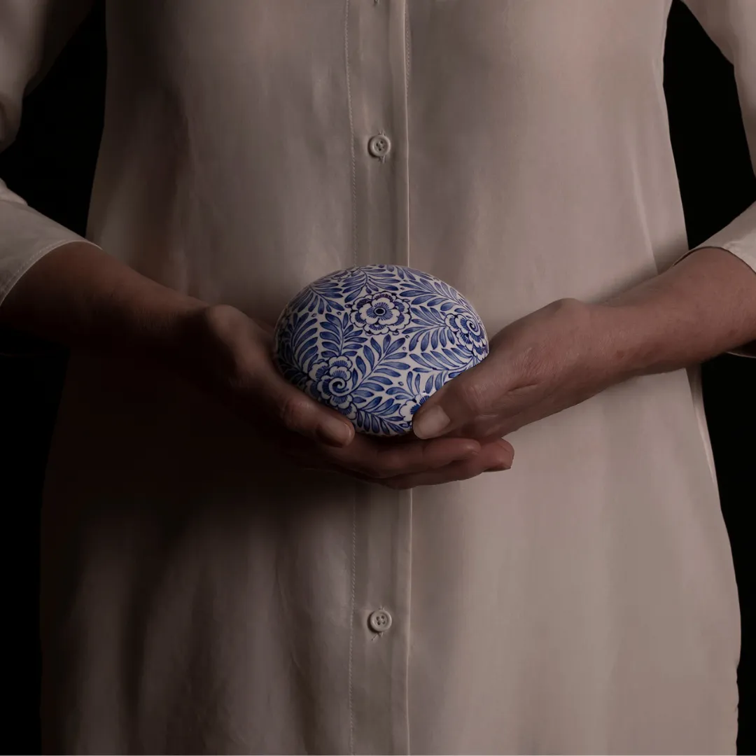 „Eine Erinnerung nistet sich ein und bleibt für immer bei dir.“Handbemalt, dezent, leicht, handlich, eindrucksvoll und zugleich unaufdringlich. Eine organische Form mit einem kompakten Verschluss. Stilvoll gestaltet. Symbolisch verziert.Zum Anfassen und Wertschätzen. Ein Kunstwerk für Ihr Zuhause mit besonderer Bedeutung. Mit dieser Mini-Urne bietet Royal Delft einer kleinen, symbolischen Menge der Asche eines geliebten Menschen ein sicheres und stilvolles Zuhause.Die handbemalten Verzierungen schöpfen aus vielfältigen Inspirationsquellen. Metaphern, Symbole und Muster, jedes mit unterschiedlichem Ursprung. Verschiedene Kunststile, die auf der Vergänglichkeit der Natur, dem Kreislauf des Lebens, Heimweh und Sehnsucht, Transformation und ewiger Liebe basieren.