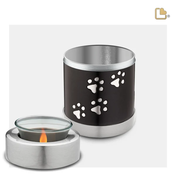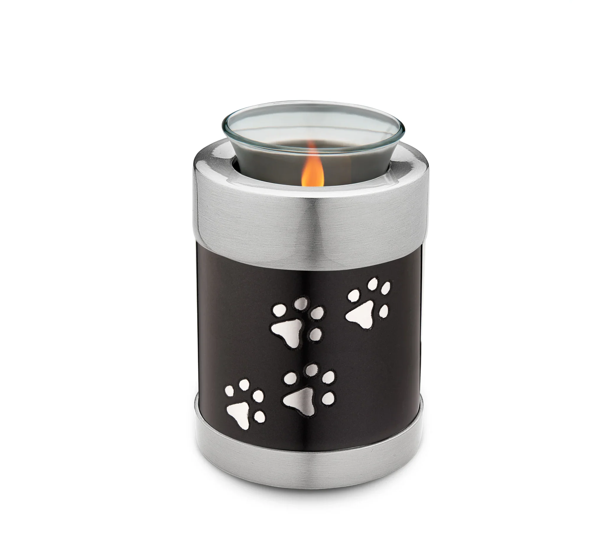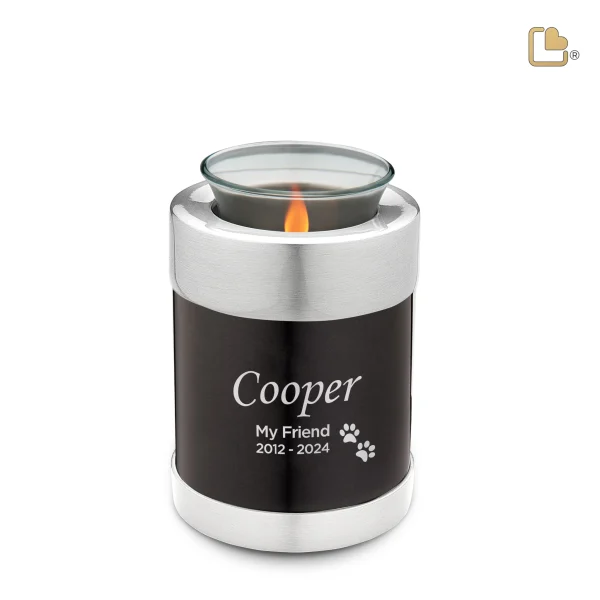 Die Teelicht-Tierurne Midnight ist eine stilvolle und würdevolle Möglichkeit, Ihr geliebtes Haustier zu ehren. Die elegante Oberfläche und die handgravierten Pfotenabdrücke verleihen der Urne eine persönliche und besondere Ausstrahlung.