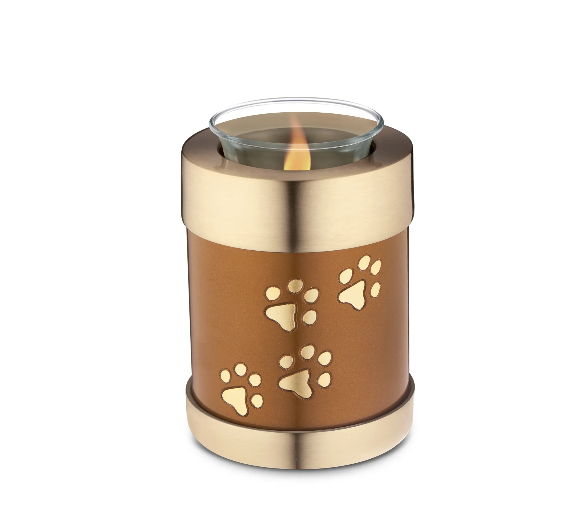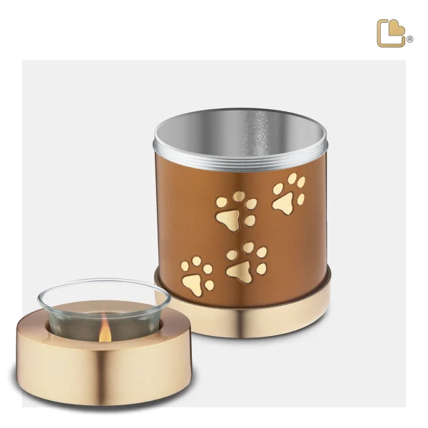 Die Teelicht-Tierurne Bronze ist eine stilvolle und würdevolle Möglichkeit, Ihr geliebtes Haustier zu ehren. Die elegante Oberfläche und die handgravierten Pfotenabdrücke verleihen der Urne eine persönliche und besondere Ausstrahlung.