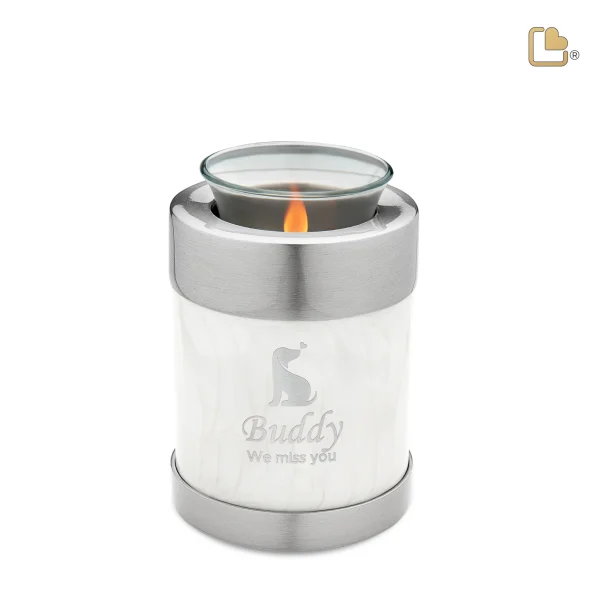Die Teelicht-Tierurne Perlmuttweiß ist eine stilvolle und würdevolle Möglichkeit, Ihr geliebtes Haustier zu ehren. Die elegante, perlmuttartige Oberfläche und die handgravierten Pfotenabdrücke verleihen der Urne eine persönliche und besondere Ausstrahlung.