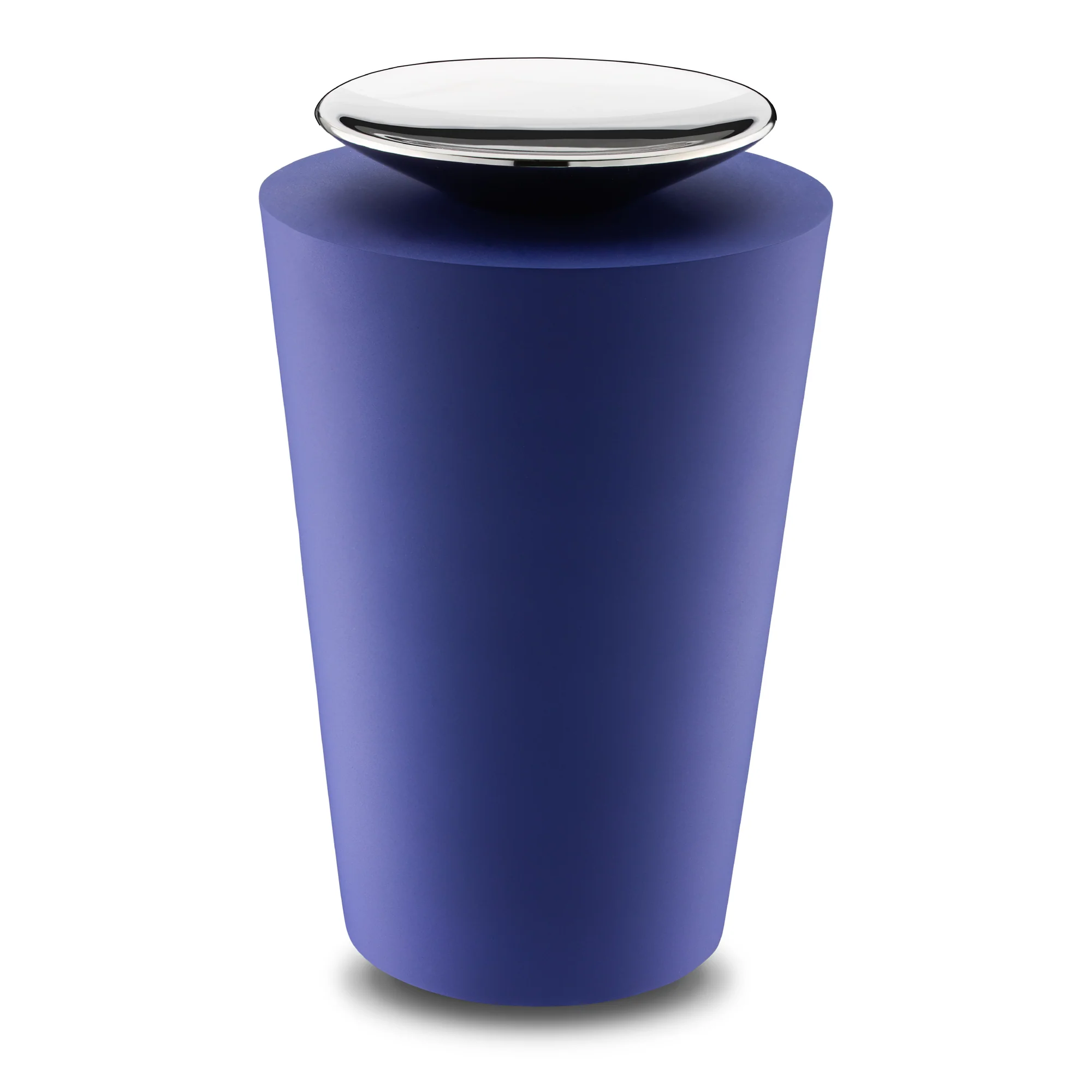Die umgedrehte Kegelform der Urne ist einzigartig in ihrem Stil und fasziniert durch ihren Indigoblau Farbton. Ein wunderschön polierter Silberverschluss ziert die majestätische Skulptur und bildet einen reizvollen Kontrast zum tiefen Blau der hohen Urne, während er gleichzeitig ihre Symmetrie unterstreicht.